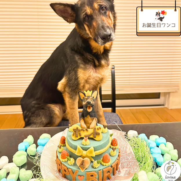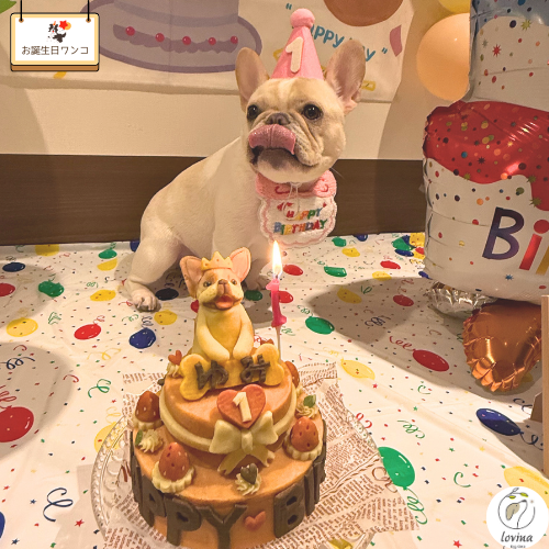 1わんこのせで下の土台が直径約13cm程度、2段目には白いリボンを巻きました。